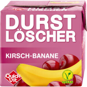 1,00 €QuickVit Durstlöscher KIBA (500ml) – Ein fruchtiger Mix aus Kirsch- und Bananensaft, der für eine erfrischende und leicht süße Abkühlung sorgt. Perfekt für heiße Tage oder als schneller Durstlöscher zwischendurch. Am besten gut gekühlt genießen, um das volle Fruchtaroma zu erleben.