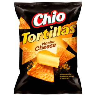 - Chio Tortillas Nacho Cheese sind knusprige Maistortilla-Chips, die mit einer würzigen Käsemischung verfeinert sind. Sie bieten einen intensiven, käsigen Nacho-Geschmack und sind perfekt zum Knabbern oder als Beilage zu Dips.