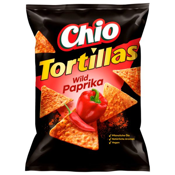Chio Tortillas Wild Paprika – Knusprige Tortilla-Chips mit dem würzigen Geschmack von wildem Paprika, ideal für einen veganen Snack-Moment.
