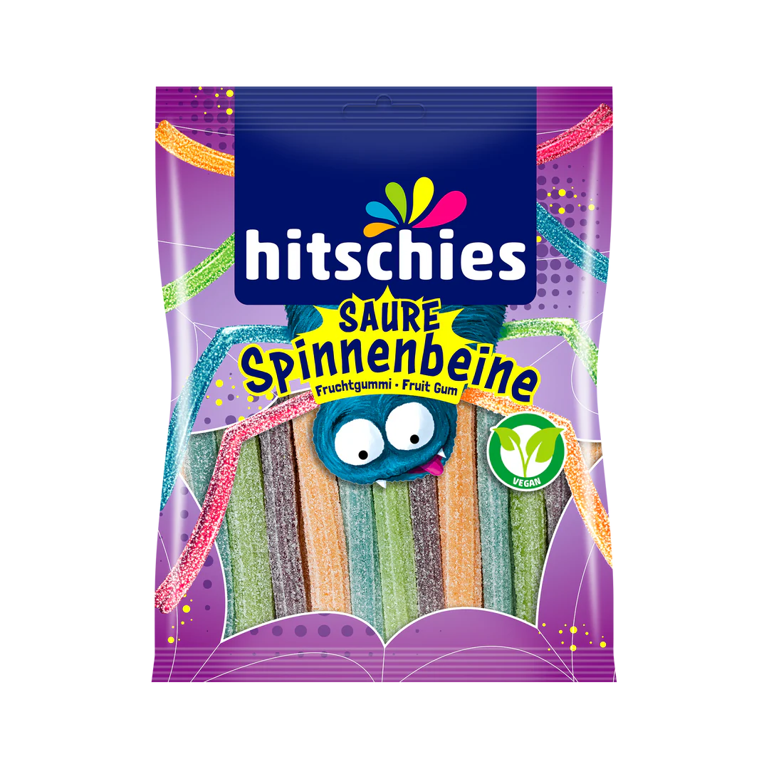 - Hitschies Saure Spinnenbeine werden in Deutschland hergestellt und sind ein beliebtes saures Fruchtgummi, das optisch an Spinnenbeine erinnert und sich durch einen intensiven, sauren Geschmack auszeichnet.