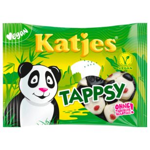- Katjes Tappsy sind vegane Fruchtgummis, die kleine Panda-Köpfe darstellen. Diese Kombination aus Fruchtgummi und Lakritz bietet einen leckeren Mix aus süßem und leicht säuerlichem Geschmack. Sie sind rein pflanzlich und kommen ohne tierische Gelatine aus.