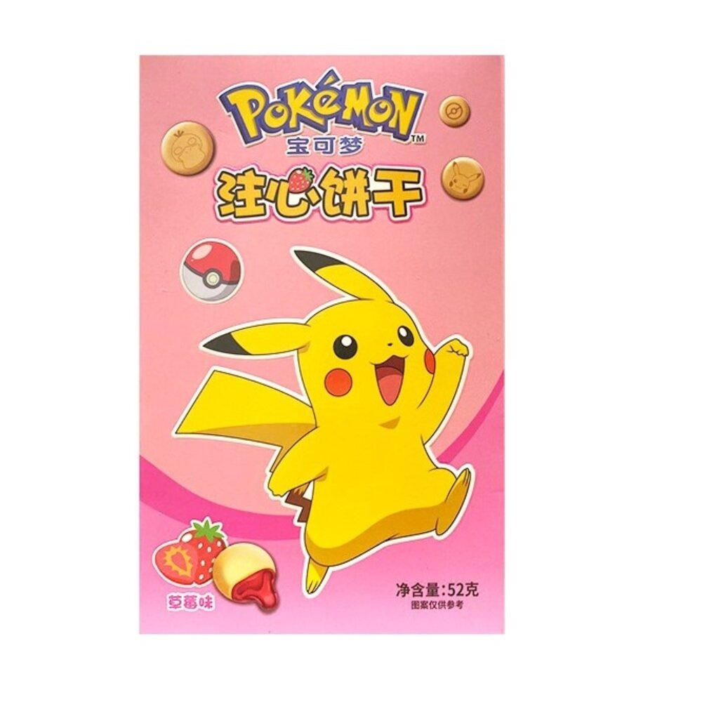 Pokémon Gefüllte Kekse Erdbeere – Leckere und knusprige Kekse gefüllt mit einer süßen Erdbeerfüllung, präsentiert im charmanten Pokémon-Design. Perfekt für kleine und große Pokémon-Fans.